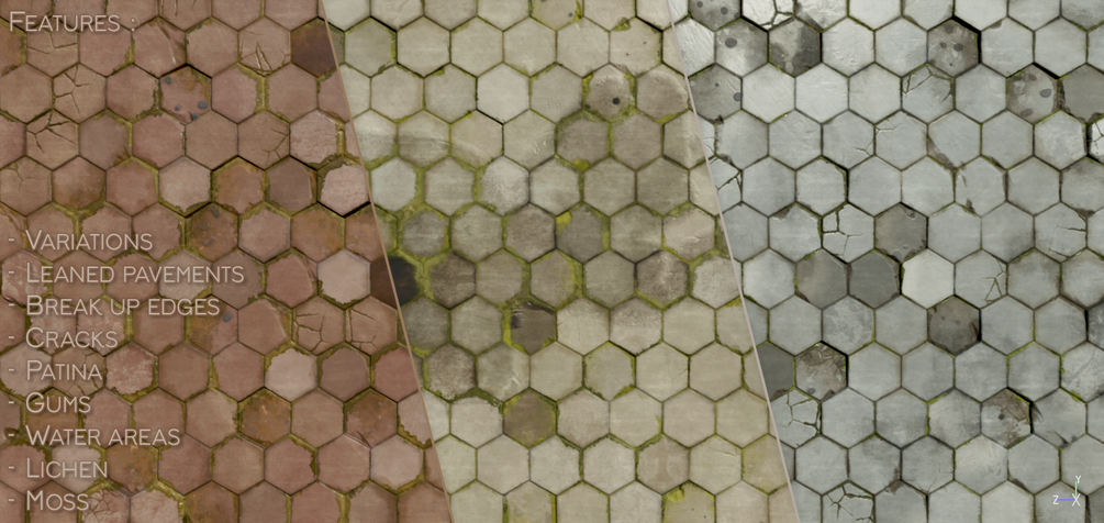 A smart material for pavement with 4 shapes available on the smart material. (Variant available with the sbs file if you want to make your own shapes with the rights parameters exposed). The material is made so you can change the actual shape and preserve every details with only 3 layers. (Joints, Variations, Gradients)